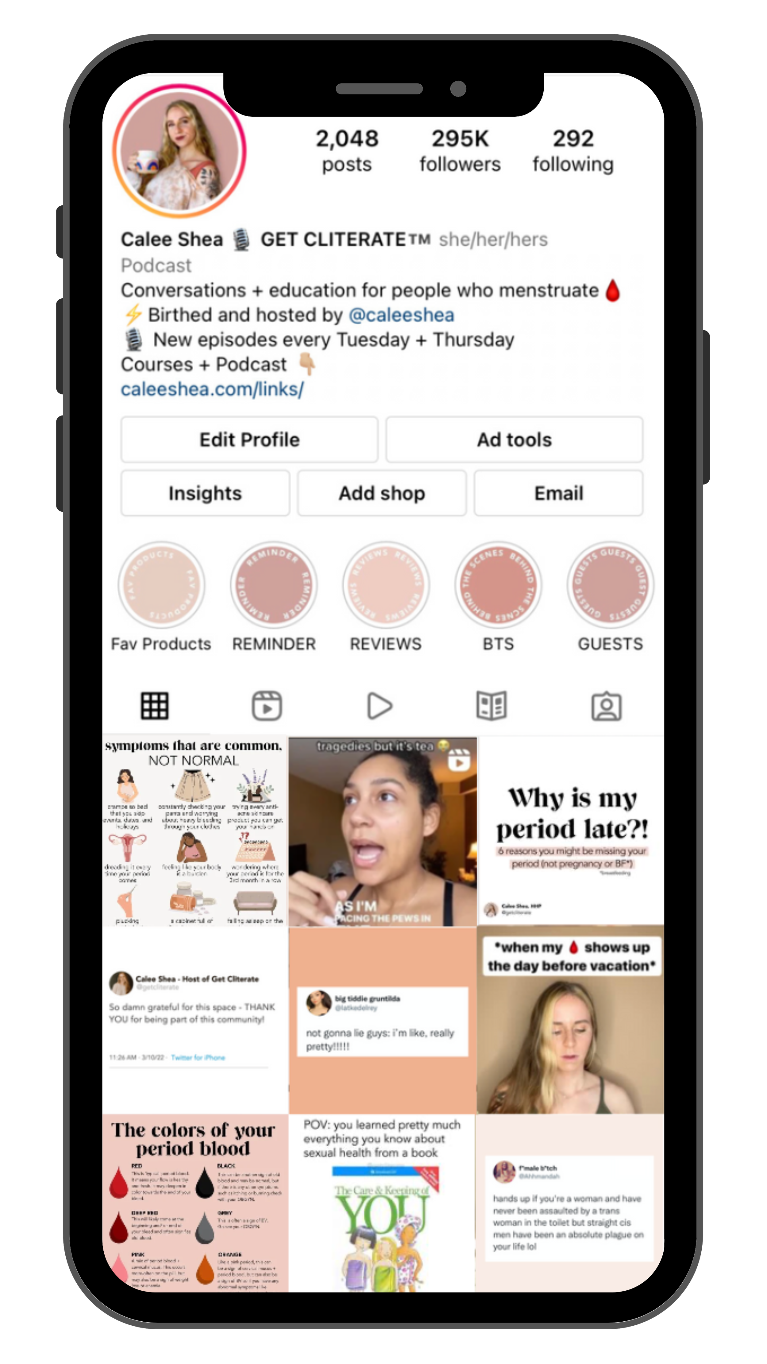 As the Social Media Manager for the Get Cliterate Podcast account (@getcliterate) from September 2021 to present, I spearhead the strategy and management of Instagram and have significantly grown the account by over 230k+ engaged followers, 12k+ Facebook Group Members and reaching 3+ million accounts monthly. My day-to-day tasks include: